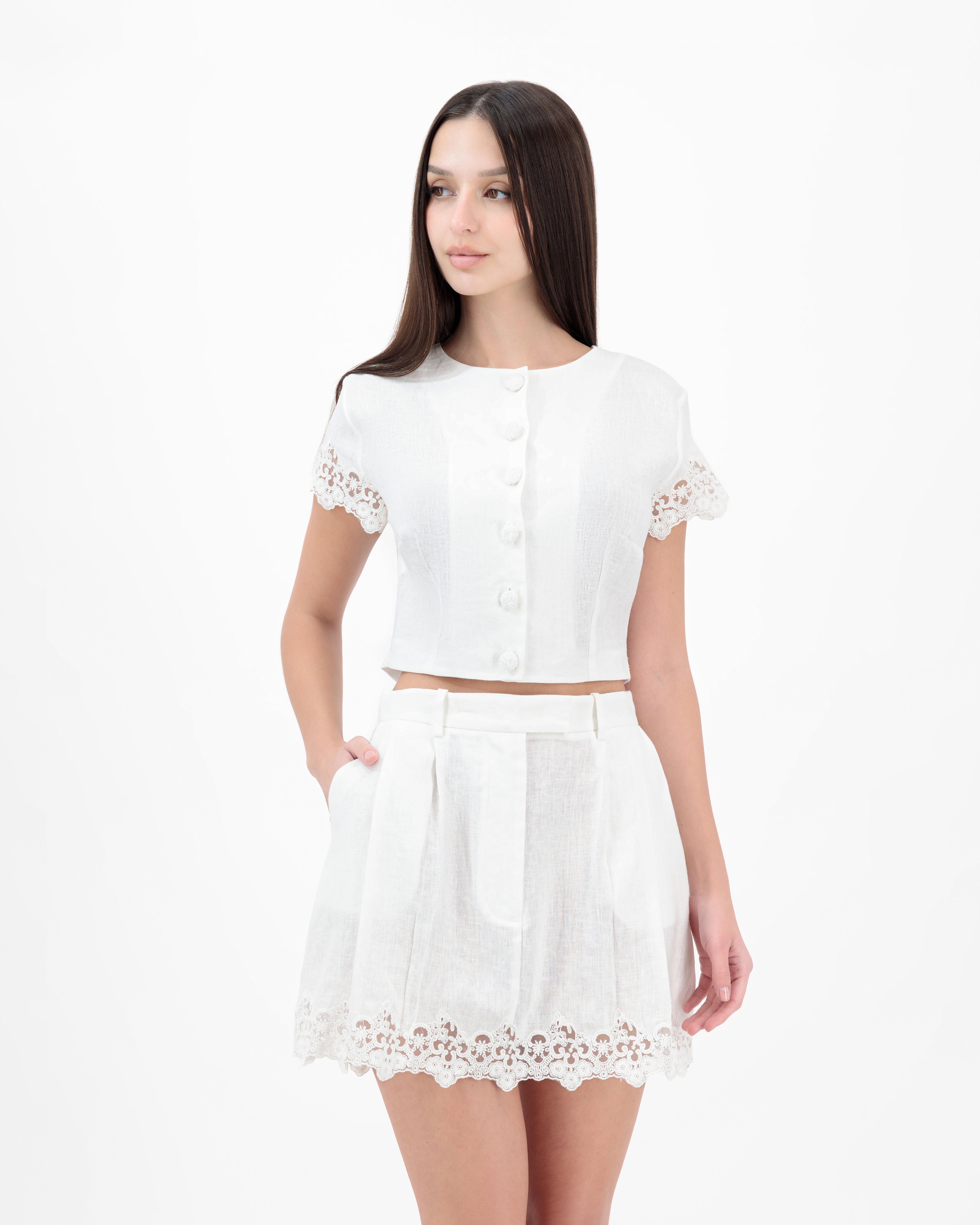 Crafted from premium linen with intricate lace detailing, this set combines a sculpted cropped top with a high-waisted mini skirt for an elevated, feminine silhouette.