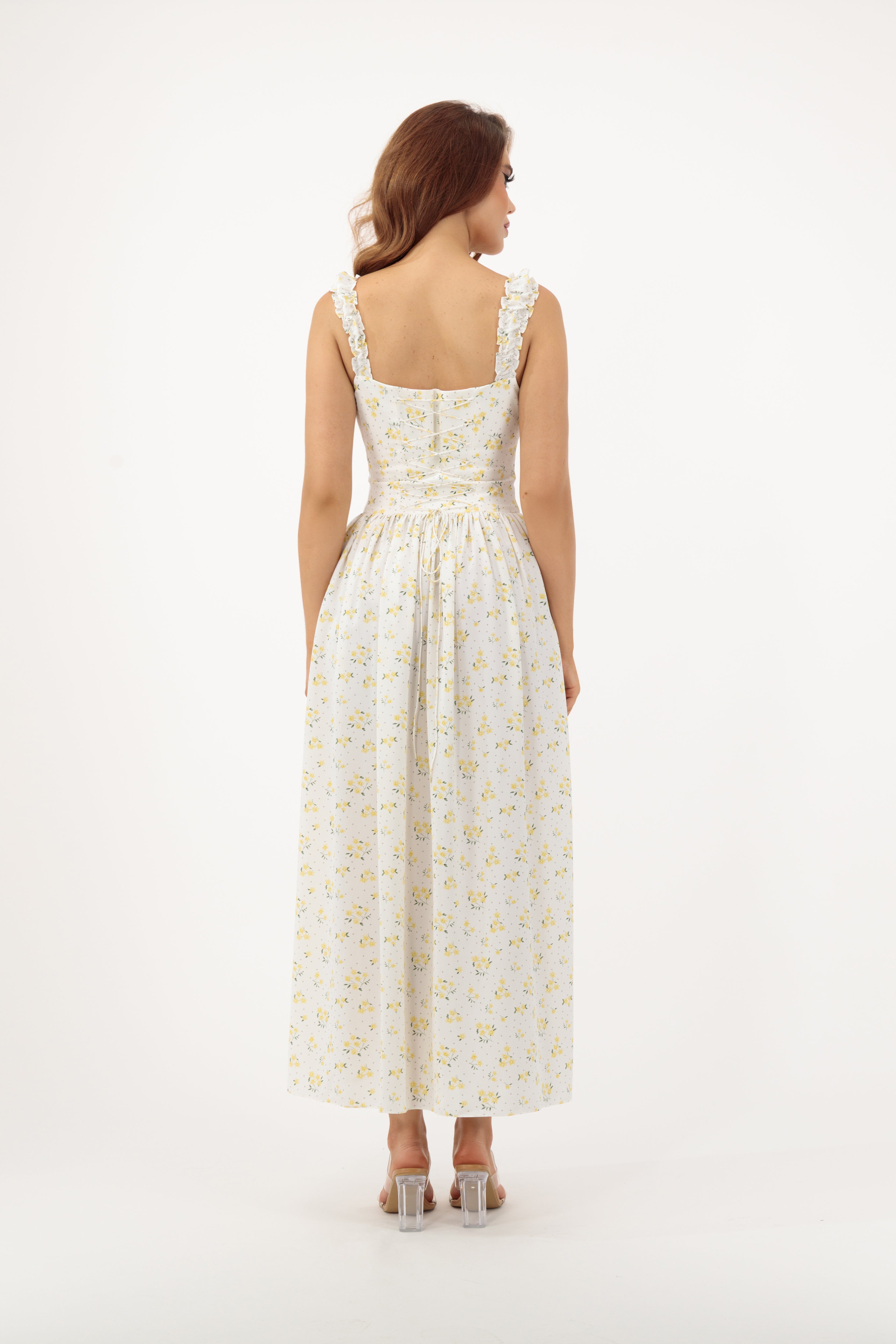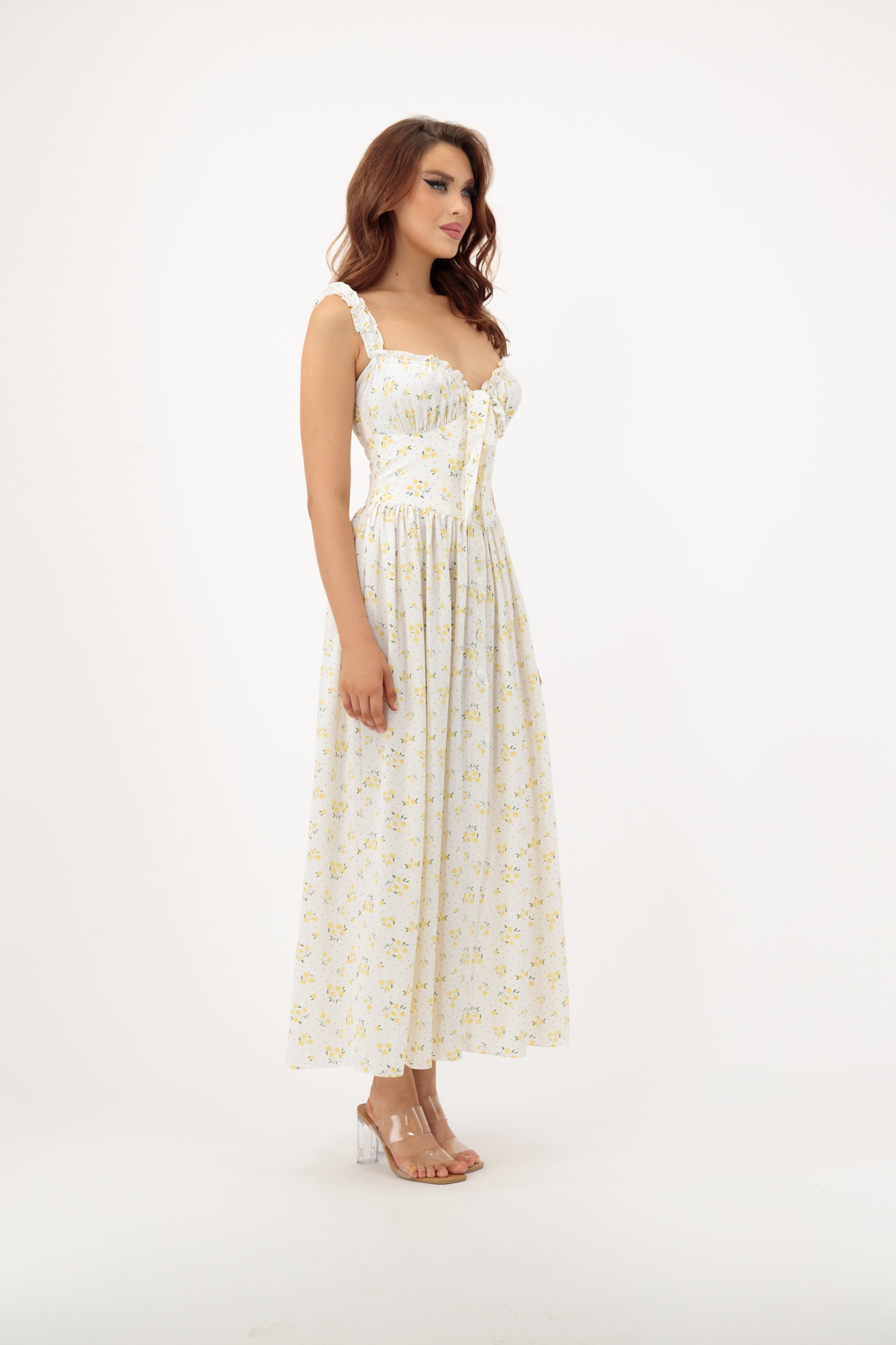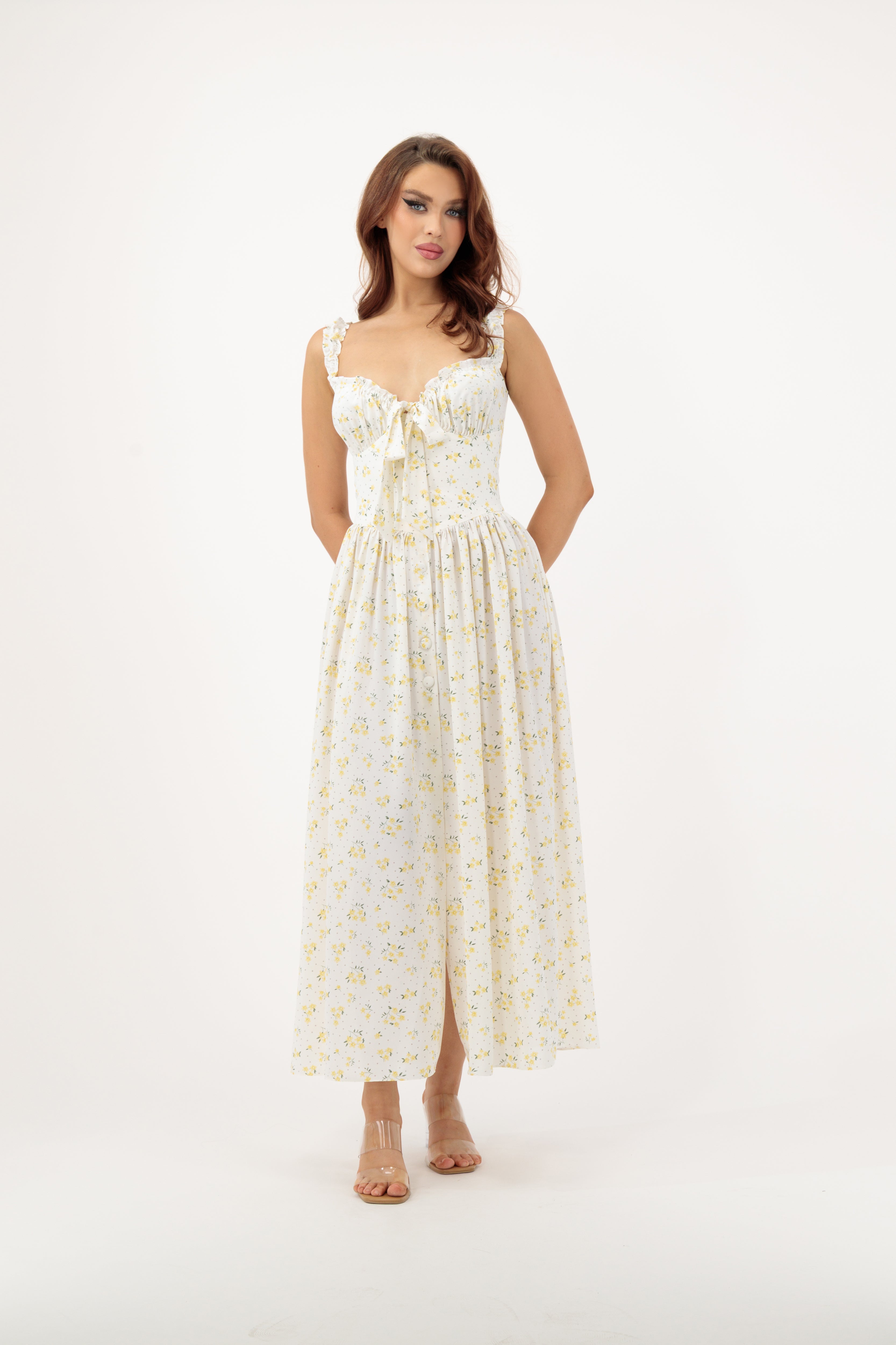 Bask in timeless charm with our romantic yellow midi dress. Featuring a sweetheart neckline with a front-tie detail, ruffled shoulder straps, and a soft flowy silhouette. This dress is perfect for sunny days, garden brunches, or effortless weekend elegance. The delicate yellow floral print on alight cream base adds a fresh, feminine touch. Style it with nude heels or sandals and keep your accessories minimal for that effortlessly chic look.