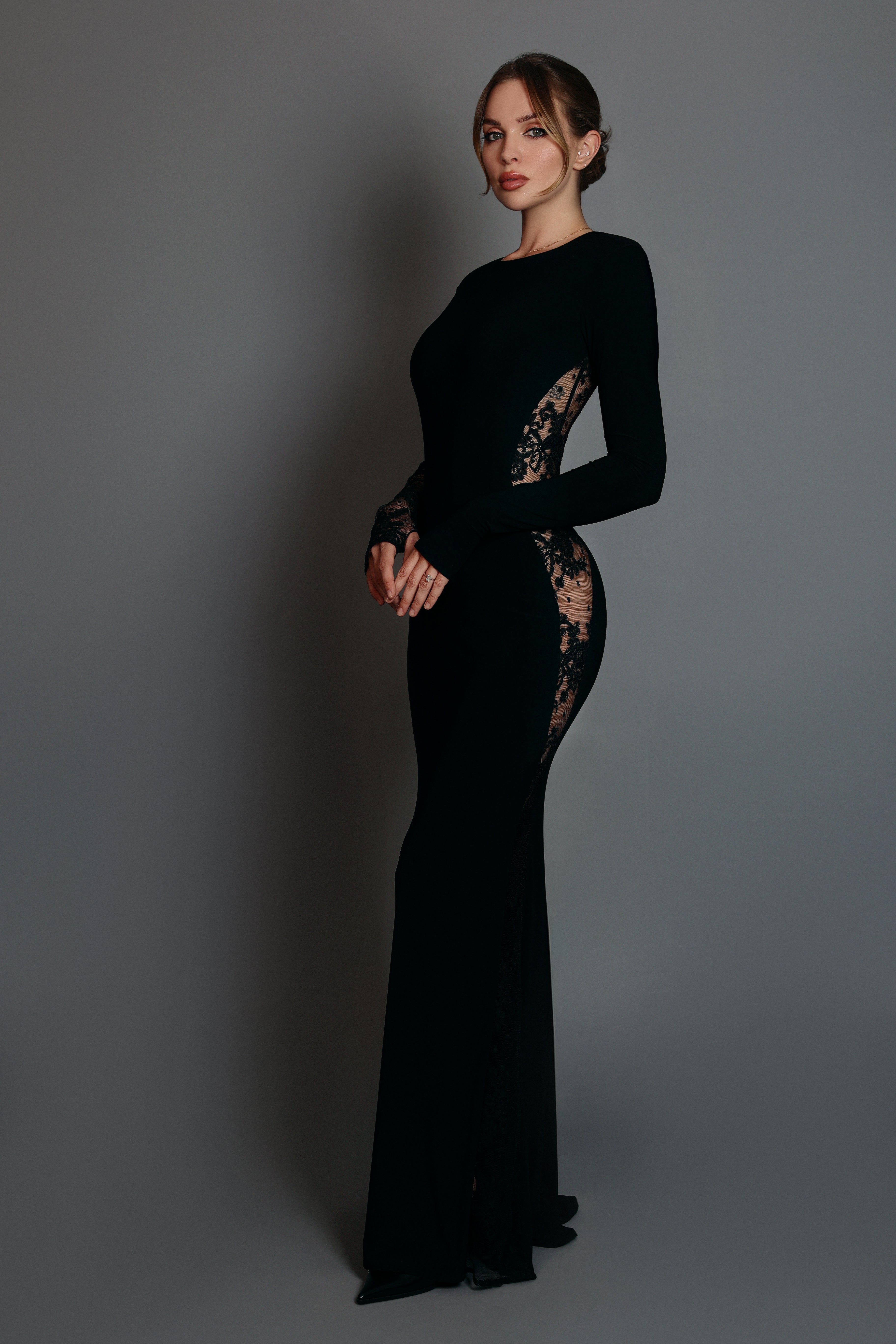 The Selene Lace Gown is the definition of dark seduction and timeless elegance. Crafted in jet black with sheer lace panels that contour the body, this floor-length masterpiece strikes the perfect balance between mystery and allure. With a high neckline, body-sculpting silhouette, and intricate lace details down the sides, back, and sleeves — this gown is designed to turn every glance into a gaze.