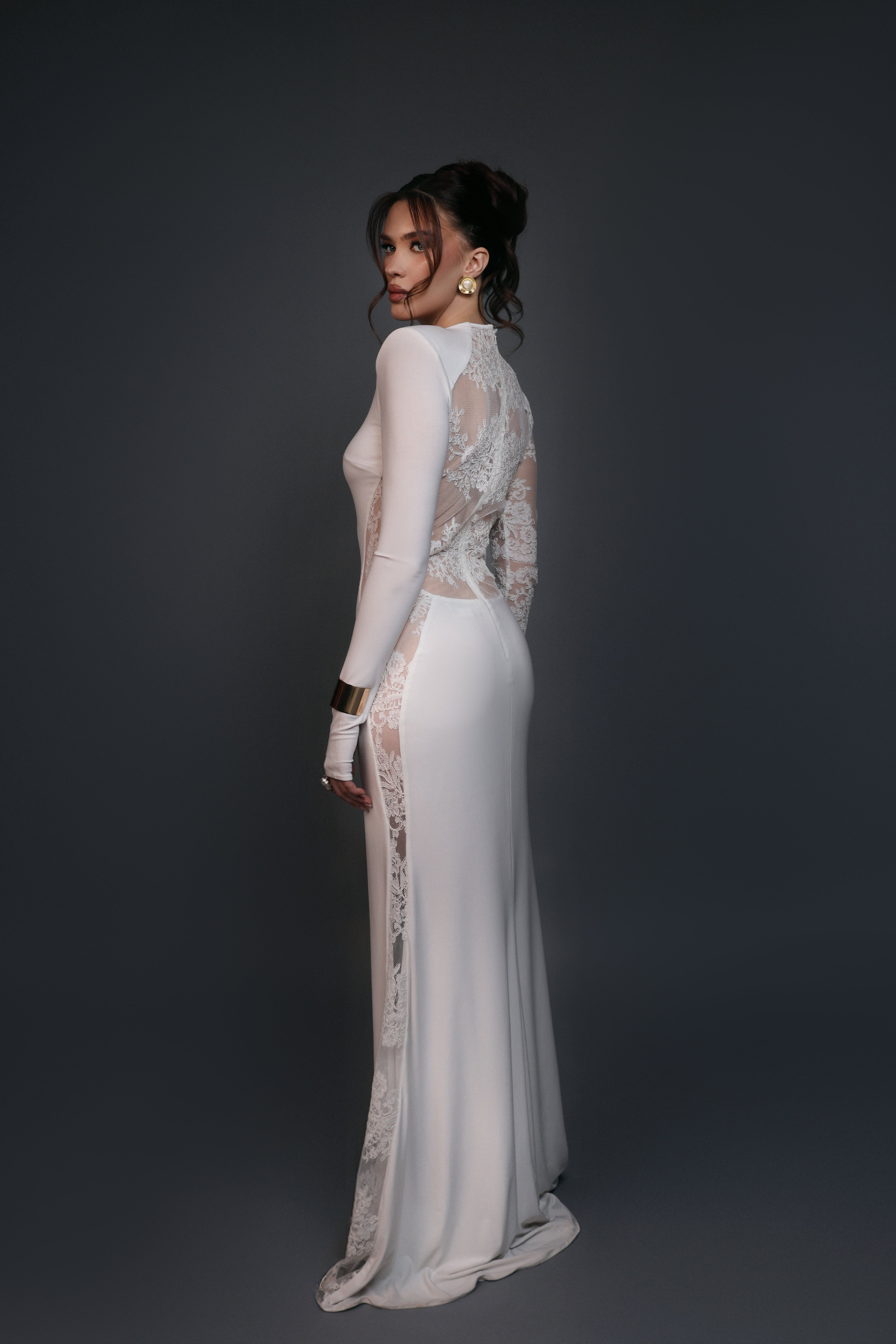 The Selene Lace Gown in Ivory is the embodiment of ethereal seduction and timeless grace. Crafted in soft ivory with sheer lace panels that contour the body, this floor-length masterpiece strikes a delicate balance between innocence and allure. With its high neckline, sculpted silhouette, and intricate lace detailing down the sides, back, and sleeves — this gown transforms every entrance into a moment.